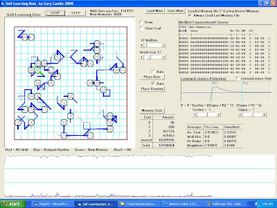 This 2D vrsion showed that this self-learning mechanism works well for what can best be described as moving particles. With a large number being possible at a time, 3D is now being attempted to model Atoms. At that level, there are a small number of atoms that need to be simulated for it to form any molecule, wjhich reduces number of behaviors needing to be taught to a small a number as possible. With their being trillions of different kinds of molecules, a memory for each one is not even possible. But having a large number of realistic atoms running at a time.