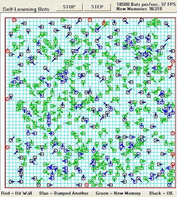 At some point there will be a trained memory that can be saved with a new file name, to be used as a read-only to model that behavior. In this example they only have to not hit walls or each other to demonstrate the most basic behavior of this mechanism. But the If..Then.. shown above can be added to, for other behaviors.